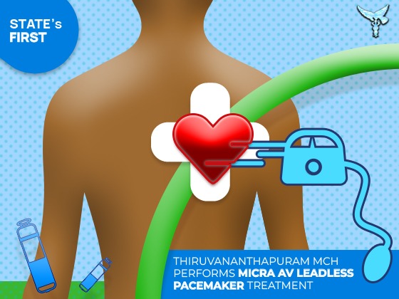 കാർഡിയോളജി വിഭാഗത്തിൽ മൈക്ര എ.വി ലീഡ്ലെസ് പേസ്മേക്കർ ചികിത്സ വിജയകരമായി പൂർത്തിയാക്കി ചരിത്ര നേട്ടവുമായി തിരുവനന്തപുരം മെഡിക്കൽ കോളേജ്. താക്കോൽ ദ്വാര ശസ്ത്രക്രിയയിലൂടെ മൈക്ര എ.വി. ലീഡ്ലെസ് പേസ്മേക്കർ ചികിത്സ നടത്തിയ ആദ്യത്തെ സർക്കാർ മെഡിക്കൽ കോളേജായി മാറിയിരിക്കുകയാണ് തിരുവനന്തപുരം മെഡിക്കൽ കോളേജ്. 74 വയസുള്ള രോഗിയിലാണ് ഈ ചികിത്സ വിജയകരമായി പൂർത്തിയാക്കിയത്.