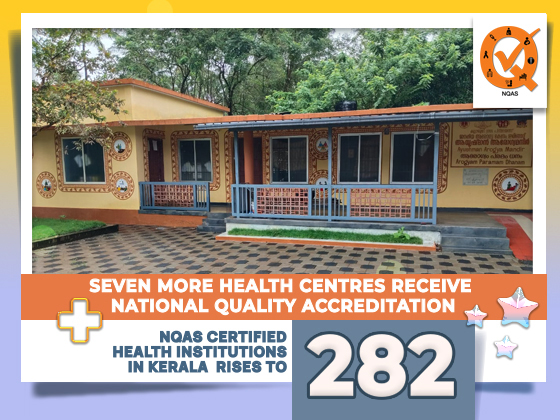 സംസ്ഥാനത്തെ 7 ആരോഗ്യ സ്ഥാപനങ്ങള്ക്ക് കൂടി നാഷണല് ക്വാളിറ്റി അഷുറന്സ് സ്റ്റാന്റേര്ഡ്സ് (എന്.ക്യു.എ.എസ്.) അംഗീകാരം. കണ്ണൂര് ഇരിണാവ് ജനകീയ ആരോഗ്യകേന്ദ്രം (83.51 ശതമാനം), കണ്ണൂര് കൊട്ടില ജനകീയ ആരോഗ്യകേന്ദ്രം (85.22 ശതമാനം), കാസര്ഗോഡ് ചോയംകോട് ജനകീയ ആരോഗ്യകേന്ദ്രം (90.68 ശതമാനം), കാസര്ഗോഡ് ബിരിക്കുളം ജനകീയ ആരോഗ്യകേന്ദ്രം (90.05 ശതമാനം) എന്നീ കേന്ദ്രങ്ങൾക്കാണ് പുതുതായി എന്.ക്യു.എ.എസ്. അംഗീകാരം ലഭിച്ചത്. തൃശൂര് നെന്മണിക്കര കുടുംബാരോഗ്യകേന്ദ്രം (88.19 ശതമാനം), തൃശൂര് പൊയ്യ കുടുംബാരോഗ്യകേന്ദ്രം (89.50 ശതമാനം), കണ്ണൂര് വളപട്ടണം കുടുംബാരോഗ്യകേന്ദ്രം (92.91 ശതമാനം) എന്നീ കേന്ദ്രങ്ങൾക്ക് 3 വര്ഷത്തിന് ശേഷം പുന: അംഗീകാരവും ലഭിച്ചു.
