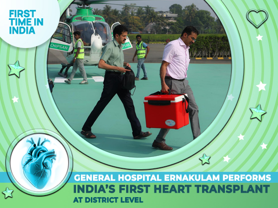 ആരോഗ്യരംഗത്ത് പുതിയൊരു ചരിത്രം കുറിച്ചുകൊണ്ട് രാജ്യത്ത് ആദ്യമായി ഒരു ജില്ലാതല ആശുപത്രിയിൽ ഹൃദയം മാറ്റിവയ്ക്കൽ ശസ്ത്രക്രിയ പൂർത്തിയാക്കി എറണാകുളം ജനറൽ ആശുപത്രി. വാഹനാപകടത്തെത്തുടർന്ന് മസ്തിഷ്ക മരണം സംഭവിച്ച കൊല്ലം ചിറയ്ക്കര ഇടവട്ടം സ്വദേശിയുടെ ഹൃദയമാണ് നേപ്പാൾ സ്വദേശിനിയായ ഇരുപത്തിരണ്ടുകാരിക്ക് മാറ്റി വെച്ചത്.