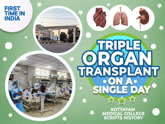ഇന്ത്യയിൽ ആദ്യമായി ഒറ്റ ദിവസം ഹൃദയം, ശ്വാസകോശം, വൃക്ക എന്നിങ്ങനെ മൂന്ന് പ്രധാന അവയവങ്ങൾ മാറ്റിവയ്ക്കുന്ന സർക്കാർ ആശുപത്രിയെന്ന നേട്ടം കൈവരിച്ച് കോട്ടയം മെഡിക്കൽ കോളേജ്. ഡൽഹി എയിംസിന് ശേഷം സർക്കാർ മേഖലയിൽ ശ്വാസകോശം മാറ്റിവയ്ക്കൽ ശസ്ത്രക്രിയ വിജയകരമായി പൂർത്തിയാക്കിയതും ഇതാദ്യമായാണ്.